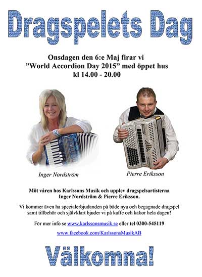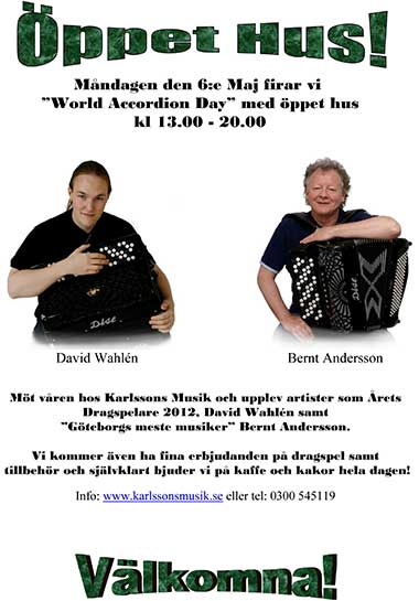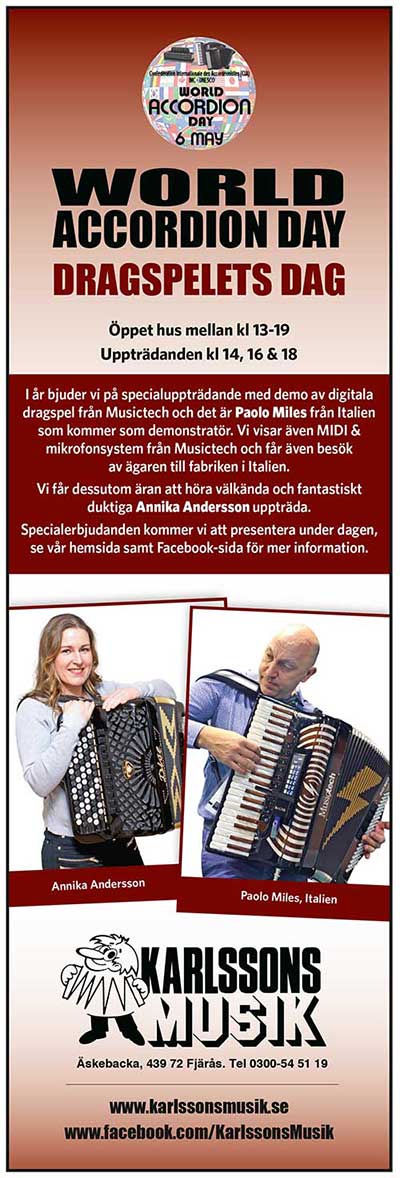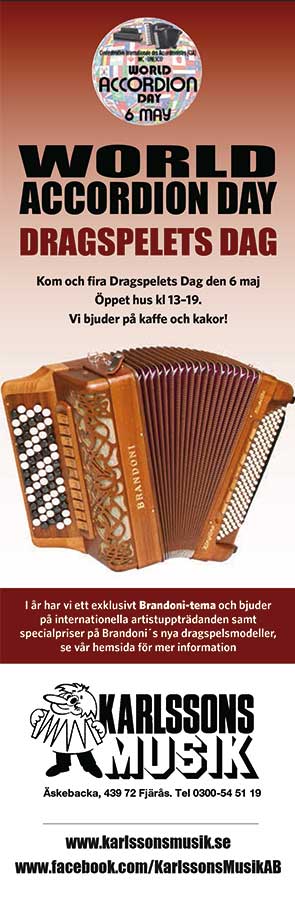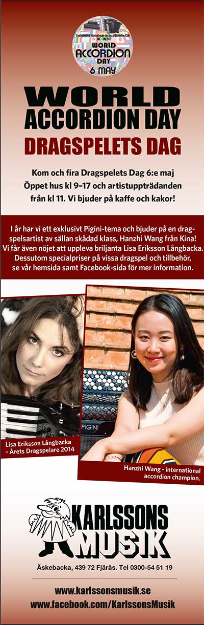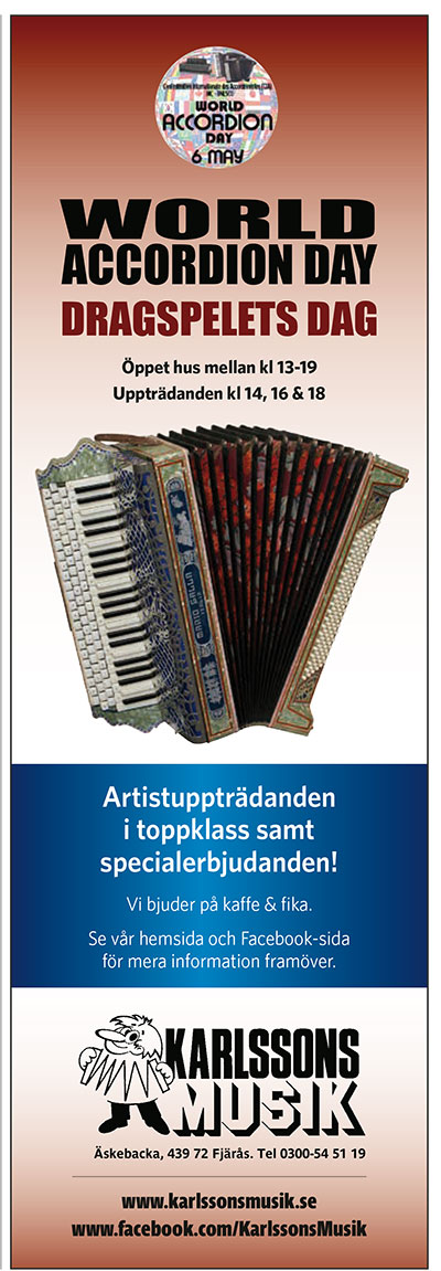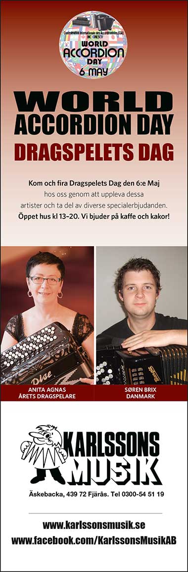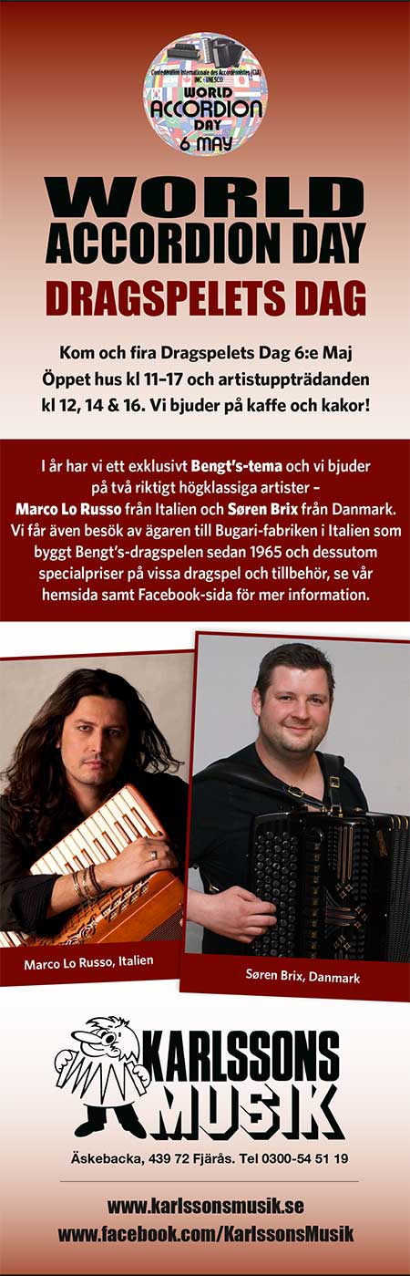 Vi firade denna dag med att ha ”öppet hus. Här och bjöds på både artister i form av Lars Holm och Bröderna Trück och instrument-demonstration (med lite nyheter) Självklart hade man möjlighet att besöka vårt unika dragspelsmuseum samt kunna ta del av specialerbjudanden! |