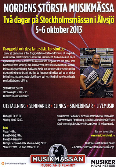 Karlssons Musik har utställning på musikmässan Musician's Planet i Stockholm 20-21 Oktober, välkomna dit för att se lite av vårt sortiment och för att prova olika dragspelsinstrument!